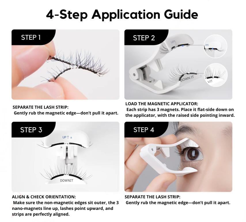 Applying the lashes is simple! Just align them with your natural lashes and let the powerful magnets do the work. It takes only seconds to secure them in place, giving you beautiful results without the mess of glue.
